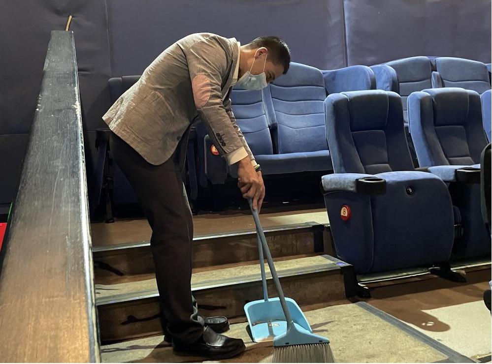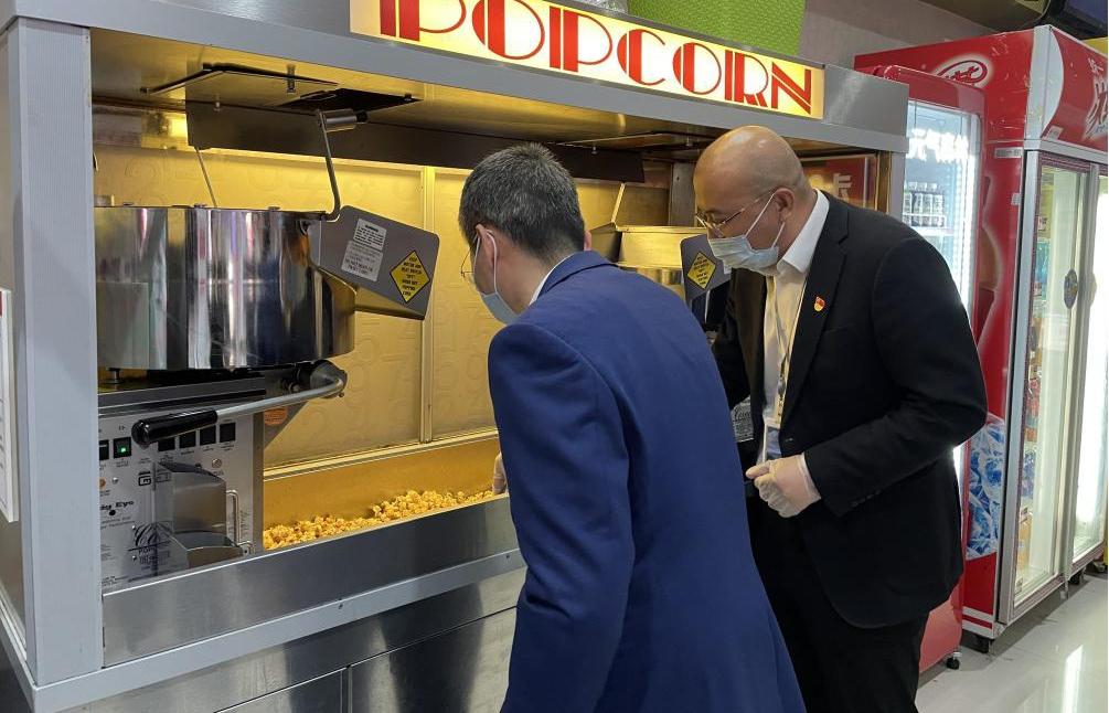 集團黨委委員、副總經(jīng)理、機關黨委書記孫超和一支部的成員一道,通過為顧客制作爆米花和飲品、對影廳進行消毒和衛(wèi)生清理,體驗了影城經(jīng)營一線的日常服務項目。