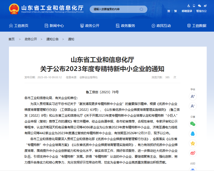 據(jù)了解,專精特新中小企業(yè)是指在產(chǎn)品、技術(shù)、管理、模式等方面創(chuàng)新能力強(qiáng)、專注細(xì)分市場(chǎng)、成長(zhǎng)性好的中小企業(yè),是推動(dòng)經(jīng)濟(jì)社會(huì)發(fā)展的重要力量。根據(jù)相關(guān)文件精神,省工業(yè)和信息化廳組織開展了2023年度專精特新中小企業(yè)培育認(rèn)定和專精特新“小巨人”企業(yè)申報(bào)(復(fù)核)推薦工作。經(jīng)企業(yè)自愿申報(bào)、各市初審?fù)扑]、合規(guī)性審核、專家評(píng)審和公示等程序,認(rèn)定4086家企業(yè)為山東省2023年度專精特新中小企業(yè)、442家企業(yè)為2023年度通過(guò)復(fù)核的專精特新中小企業(yè),有效期至2026年12月31日。