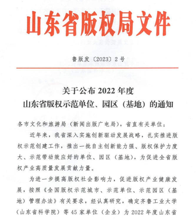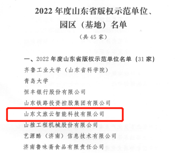 近日,山東省版權(quán)局公布2022年度山東省版權(quán)示范單位、園區(qū)(基地)名單,山東文旅云智能科技有限公司(簡(jiǎn)稱“文旅云公司”)入選“山東省版權(quán)示范單位”。