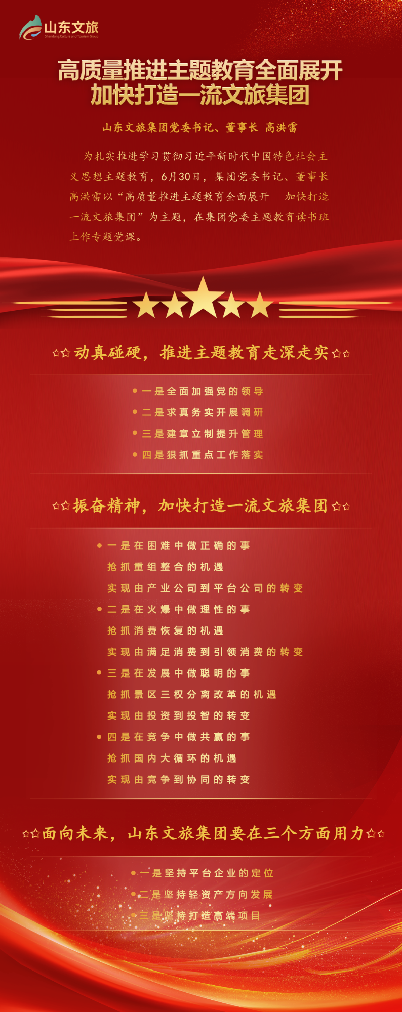為扎實推進學習貫徹習近平新時代中國特色社會主義思想主題教育,6月30日,集團黨委書記、董事長高洪雷以“高質量推進主題教育全面展開 加快打造一流文旅集團”為主題,在集團黨委主題教育讀書班上作專題黨課,集團黨委副書記、總經理丁藝主持。
