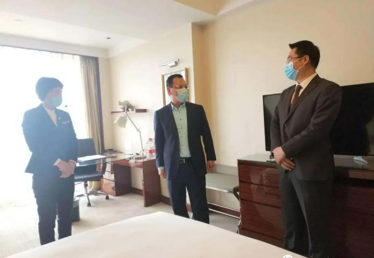 經過體溫檢測等程序后,劉守亮來到B座頤庭閣客房、上善坊自助餐廳實地查看酒店疫情防控工作。在聽取酒店總經理韓峰關于疫情防控落實措施和復工復產情況的匯報后,劉守亮對酒店客房內增設“紫外線消毒車”、“免洗酒精噴霧”,嚴格落實“單人單桌”“分餐位上”“公勺公筷制”等防疫舉措給予肯定。