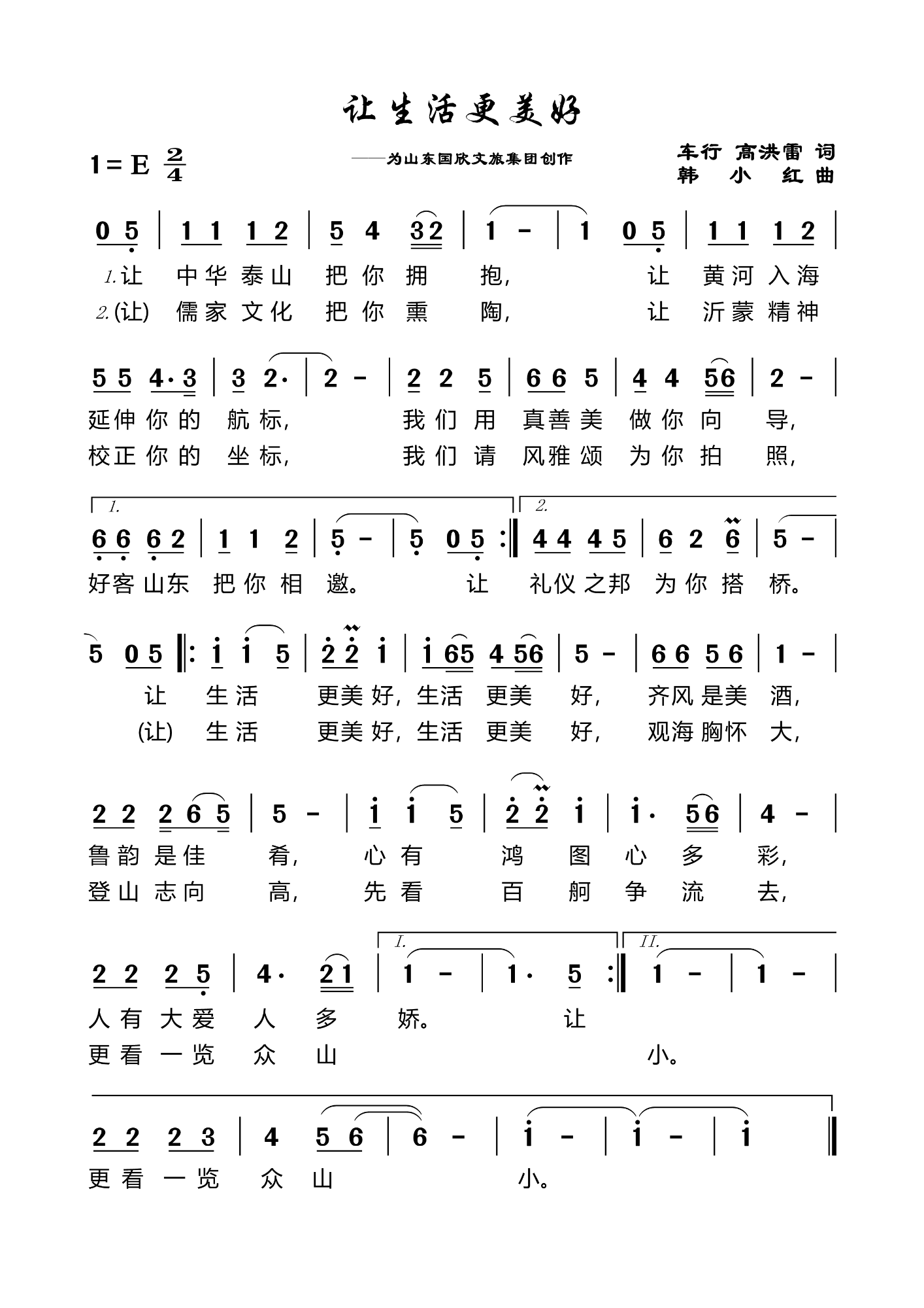 《讓生活更美好》是由國欣文旅攜手一線藝術創作團隊共同打造的一首悅耳動聽的抒情歌曲,由空軍政治部文工團創作室主任、中國音樂文學學會副主席車行,魯商集團黨委書記、董事長兼國欣文旅黨委書記、董事長高洪雷作詞,青年作曲家韓小紅作曲。