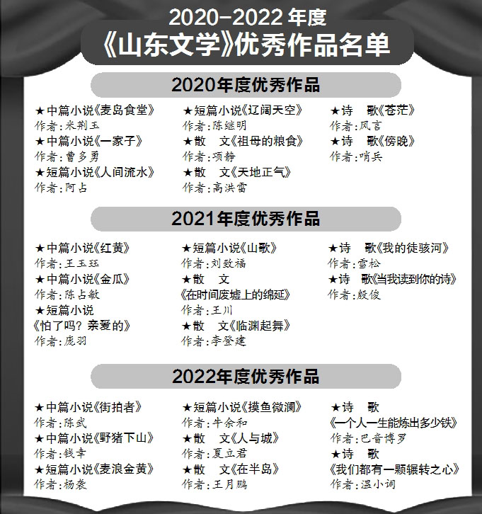 “《山東文學》年度優秀作品”是《山東文學》編輯部自2018年以來設立的文學獎項,每年一屆,目前已成功舉辦五屆。受疫情影響,此次《山東文學》優秀作品評選時間范圍由2020年延長至2022年,旨在鼓勵作家在《山東文學》期刊上發表更多思想性和藝術性俱佳的原創優秀文學作品,進一步鞏固和提升期刊的影響力,吸引更多優秀作家奉獻精品佳作,進而推出更多具有中國精神、齊魯風格的名篇佳作,用優秀作品呈現當下現實生活、弘揚時代精神。