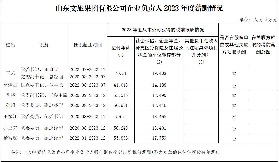 山東文旅集團(tuán)有限公司企業(yè)負(fù)責(zé)人2023年度薪酬情況